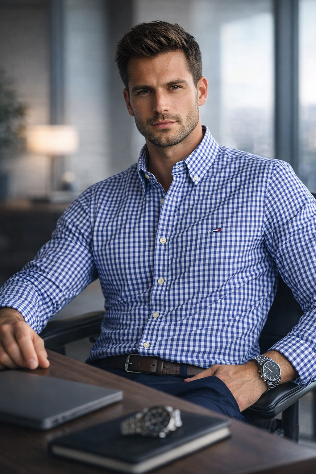A Camisa Tommy Hilfiger Regular é para o homem que entende que imagem é posicionamento. O padrão gingham traz sofisticação moderna, enquanto o algodão com elastano entrega mobilidade e conforto absoluto durante o dia inteiro.