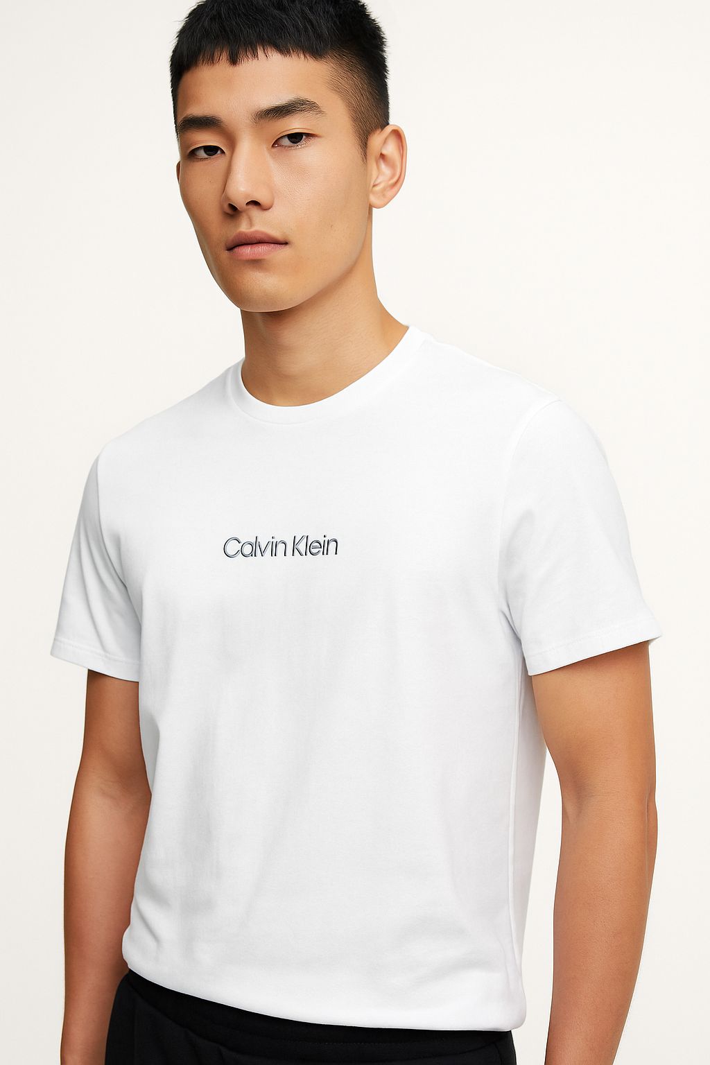 CAMISETA MASCULINA EM MEIA MALHA DE ALGODÃO, GOLA CARECA, MANGA CURTA COM DETALHE DE ASSINATURA FRONTAL BORDADA CALVIN KLEIN LOUNGEWEAR.