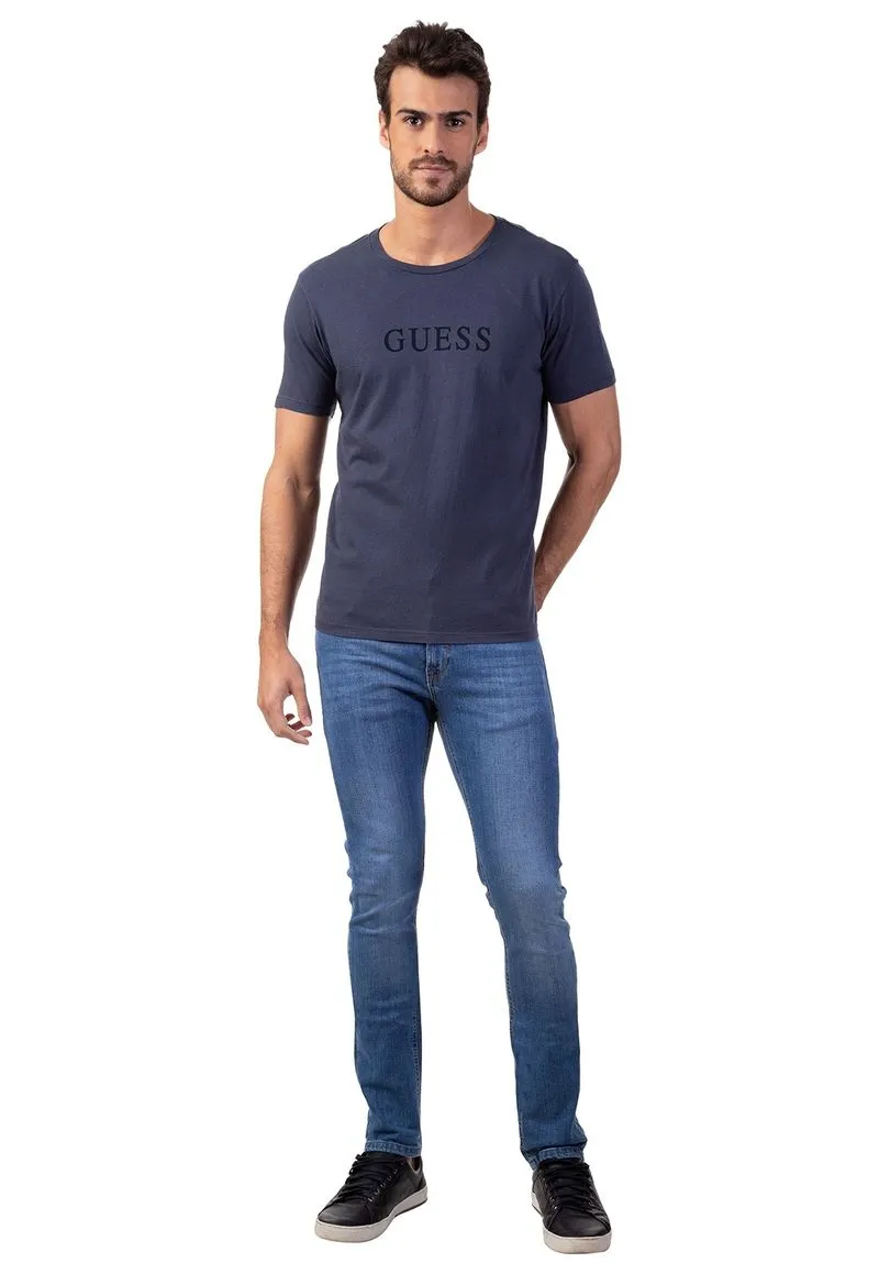 Camiseta Silk Relevo Guess Azul Escuro, ideal para o dia a dia, camiseta confeccionada em tecido de algodão, possui gola arredondada, mangas curtas, comprimento regular e logo frontal em silk em relevo. Composição:100% Algodão